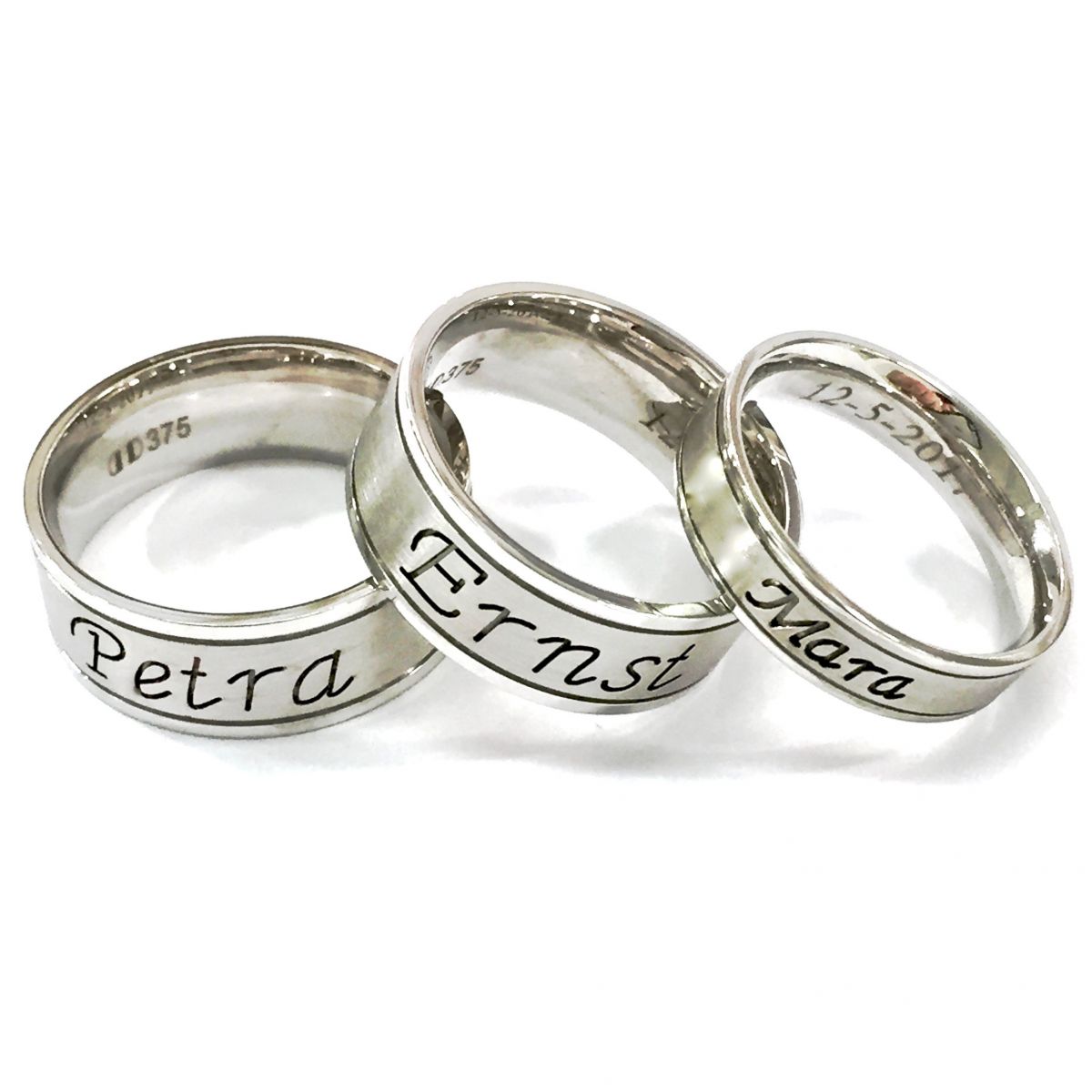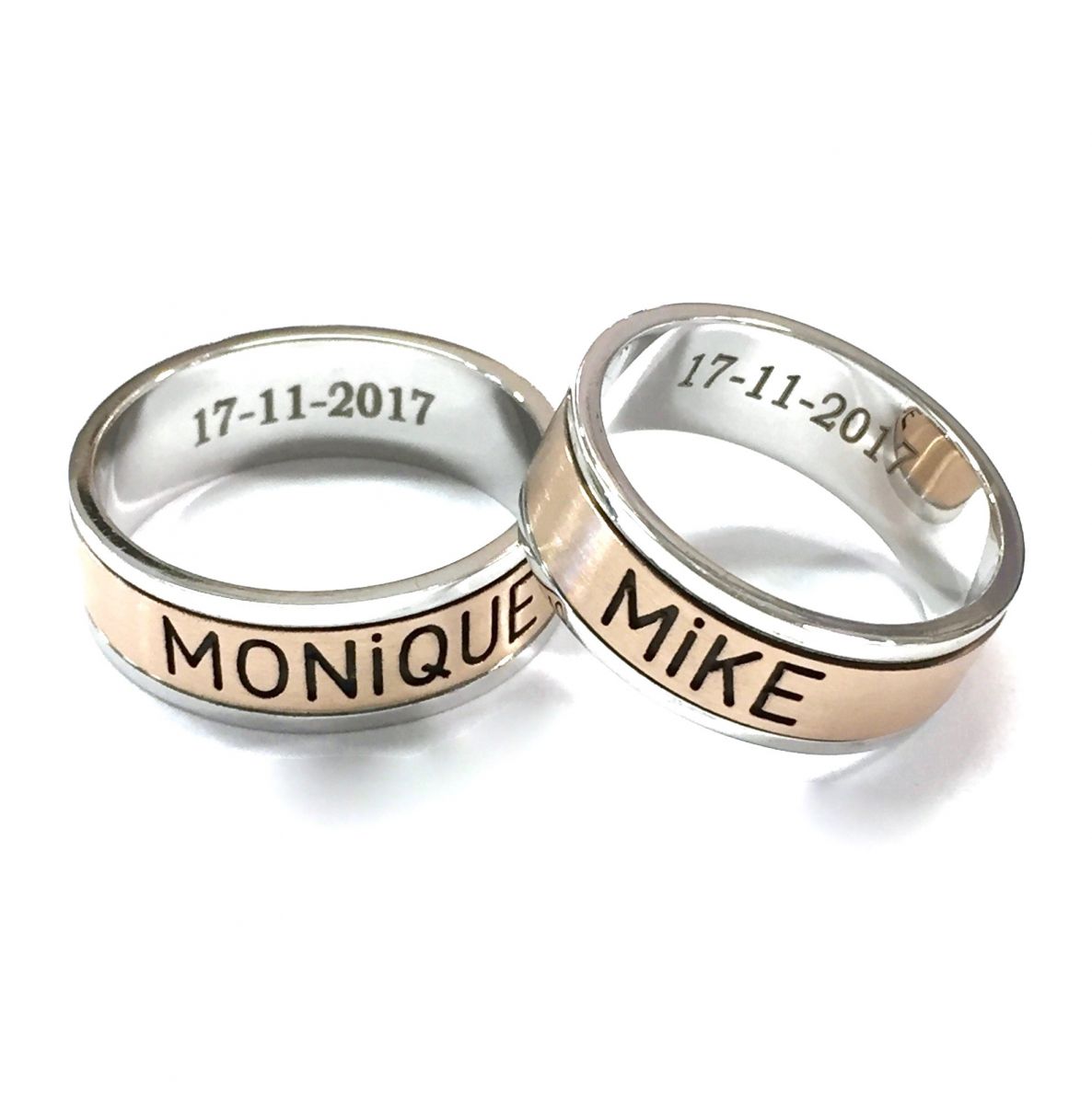 Bij ons is het mogelijk om een naam, datum of een persoonlijke tekst aan de buitenkant van de ringen in te frezen. Steeds meer stellen vinden het leuk om de gravures niet binnen in de ring te laten maken maar juist aan de buitenkant.